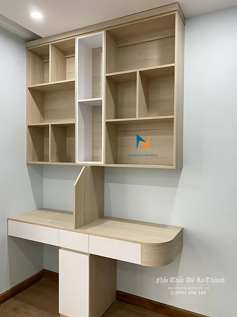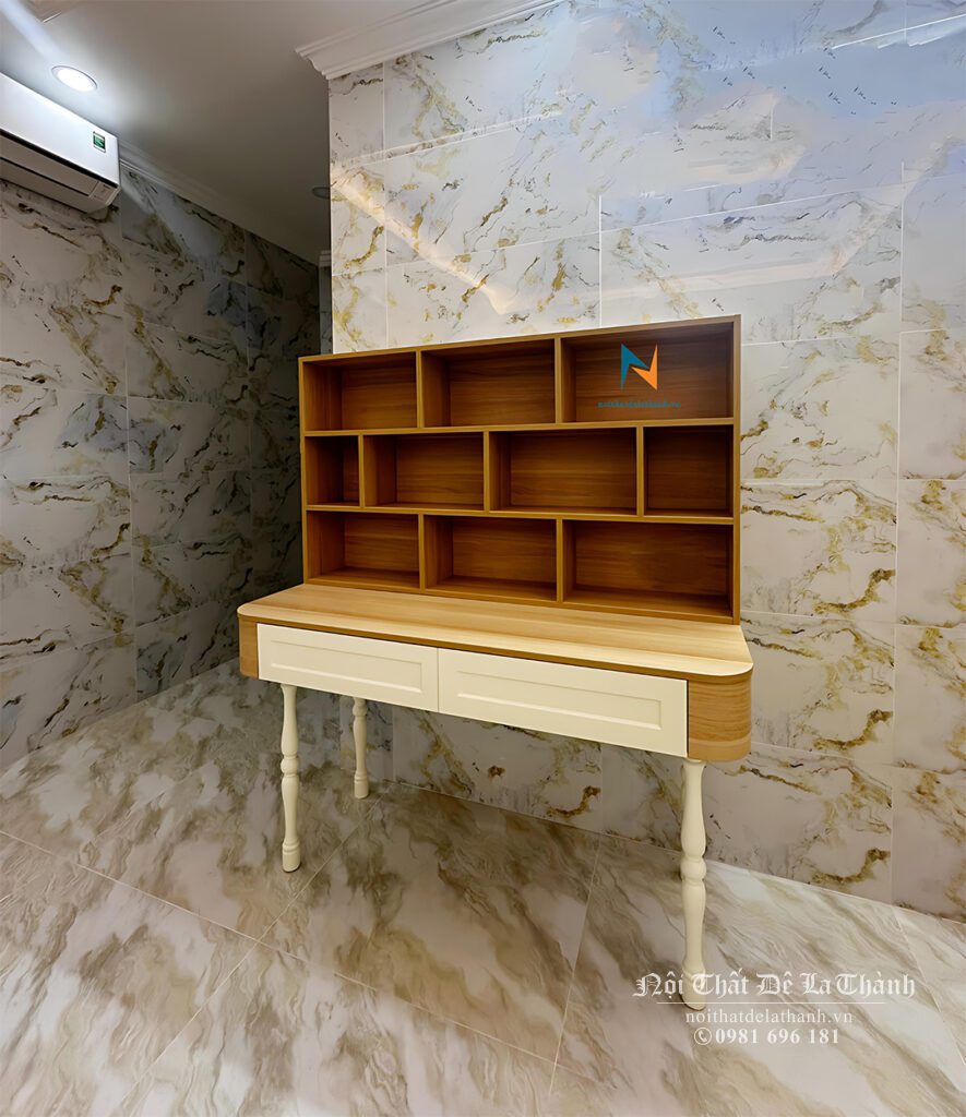 Chiếc bàn học đôi dành cho 2 bé trai tiểu học, kích thước 1m30x2m6 kịch trần, bàn được thiết kế theo yêu cầu riêng với nhiều nét phá cách ấn tượng, phối màu gỗ vàng nhạt và màu cánh trắng