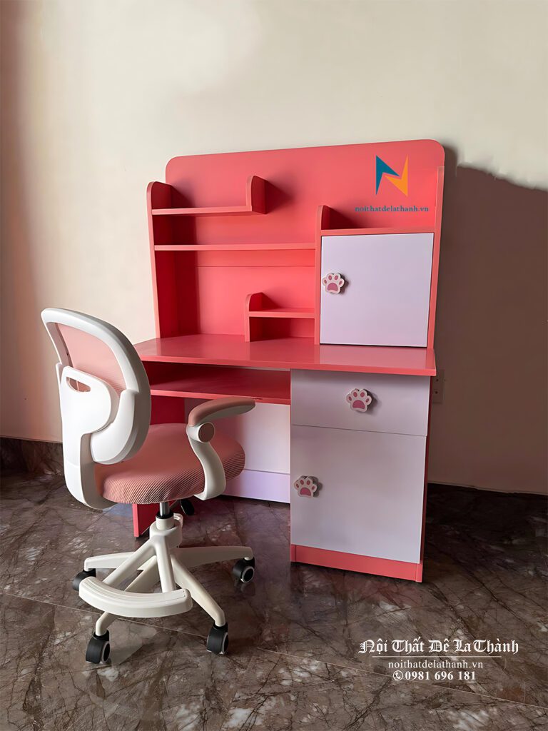 Chiếc bàn học đơn màu hồng pha trắng, kích thước 1mx1m3 dành cho bé gái cấp 1, thiết kế bàn liền giá sách