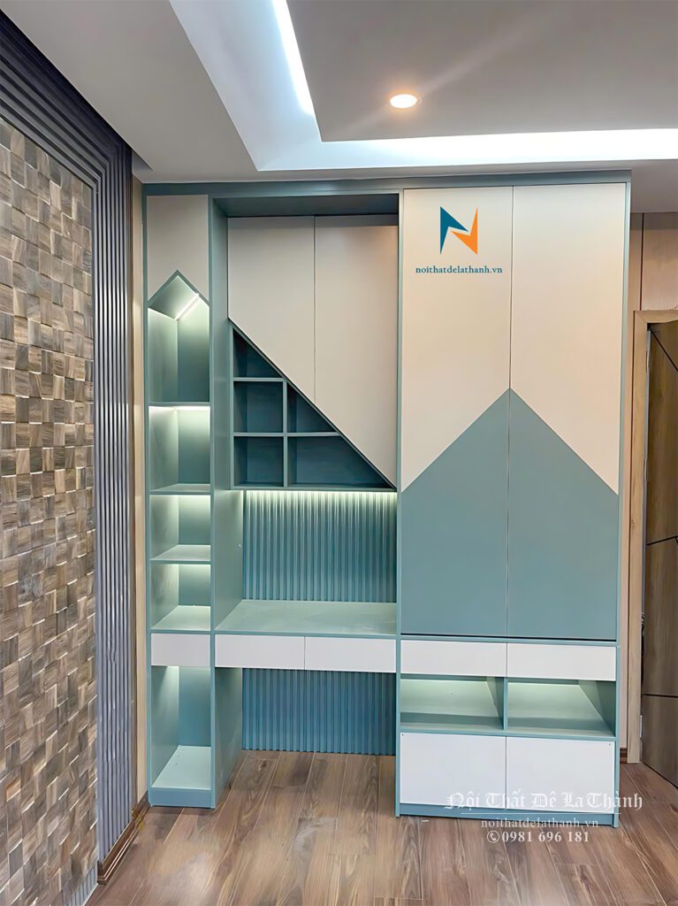 Chiếc bàn học thiết kế liền tủ quần áo bên phải, giá sách bên trái, dành cho bé trai tiểu học, kích thước tổng thể 1m4x2m6 kịch trần, phối màu xanh và màu trắng rất đẹp