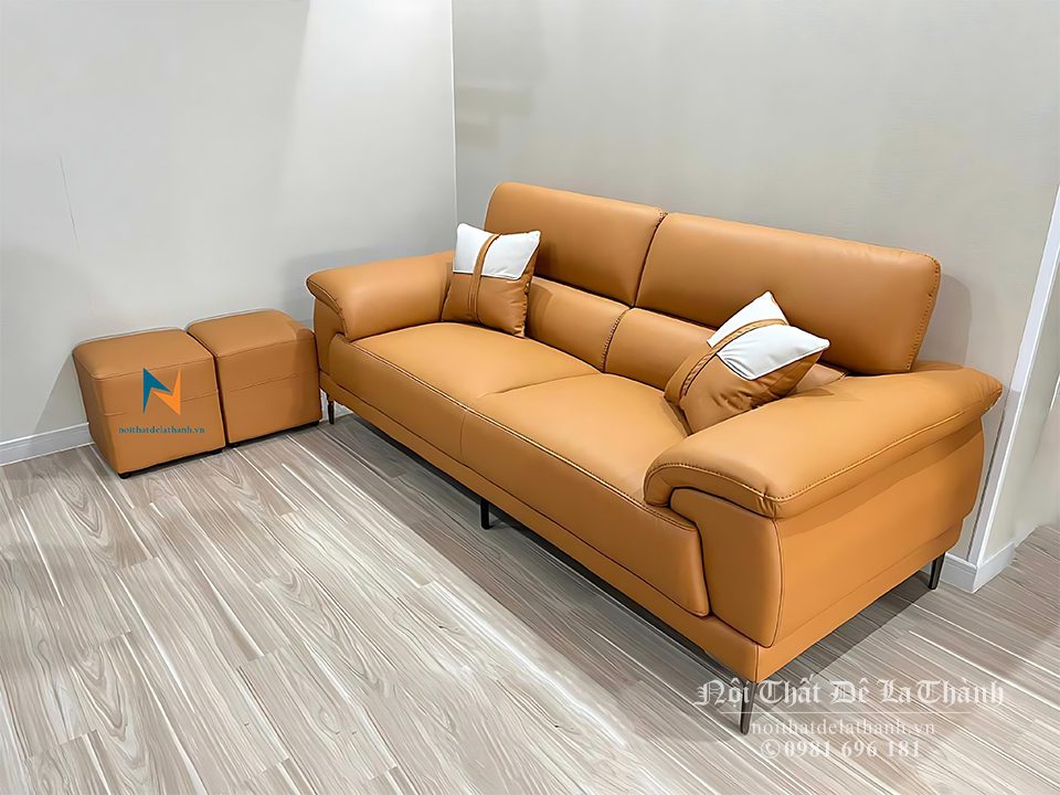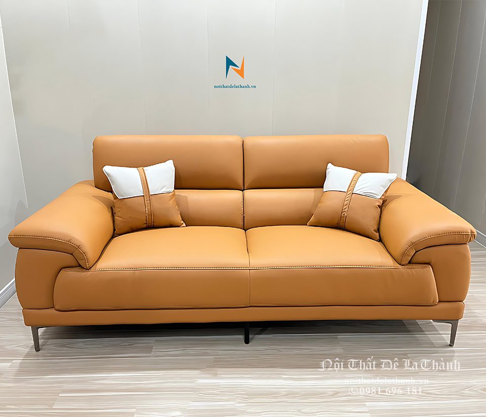 Mẫu ghế sofa này ấn tượng bởi màu ginger bắt mắt, dễ dàng kết hợp với nhiều màu sắc khác. Tông màu da bò bao phủ toàn bộ ghế bao gồm phần đệm ngồi và phần tựa lưng. Riêng gối ôm kết hợp thêm màu trắng góp phần tạo điểm nhấn cho sản phẩm. Ngoài gam màu nâu, bạn có thể tùy ý lựa chọn màu khác phù hợp với sở thích bản thân.
