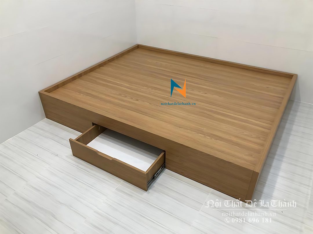 Chiếc giường bệt không đầu cao có ngăn kéo, kích thước 1m6x2m, màu nâu vân gỗ, vai trái có 1 ngăn kéo để đồ