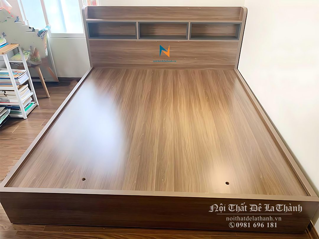 Phần đầu giường cao (thành giường) được thiết kế vững chắc với 2 ngăn kệ nằm ngang. Ngăn kệ dưới được chia làm 3 ngăn nhỏ chứa đồ. Đây là nơi bạn lưu trữ các vật dụng nhỏ như sách, điện thoại, hoặc đồng hồ báo thức,…