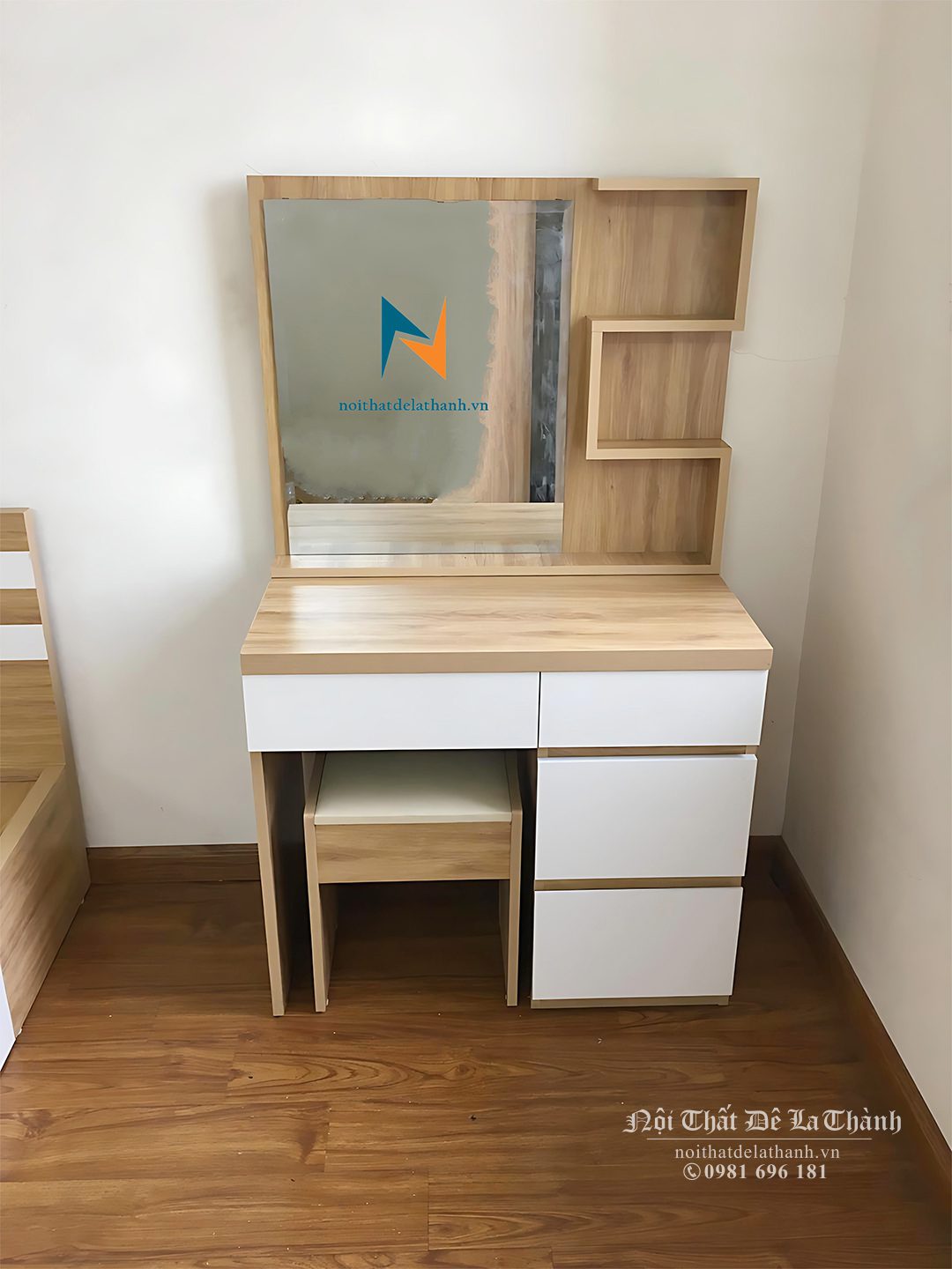 Góc còn lại là bàn trang điểm 80cm, phía dưới bàn là hai ngăn kéo ngang tay vát. Ngoài ra, bàn còn có hai ngăn kéo đứng tạo thành một chiếc chân bàn vững chắc. Phía trên bàn là một tấm gỗ được dựng thành một góc vuông với mặt bàn. Trên tấm gỗ là tấm gương hình chữ nhật trong suốt.