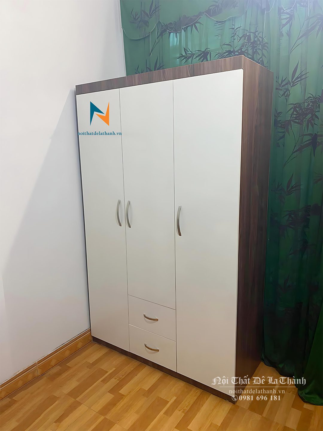 Kích thước tủ quần áo là 120cm x 200cm. Tủ quần áo bao gồm 2 buồng, 2 cánh dài và 1 cánh cộc. Phía dưới cánh cộc là 2 ngăn kéo nhỏ. Bên trong mỗi buồng được lắp đặt một thanh ngang được dùng để treo đồ vô cùng tiện lợi. Ngoài ra, tủ được trang bị 2 hộc tủ nhỏ bên trong được ngăn cách bởi tấm vát gỗ. Bên ngoài cánh tủ và ngăn kéo là tay nắm cửa bằng kim loại được bo cong tinh tế.